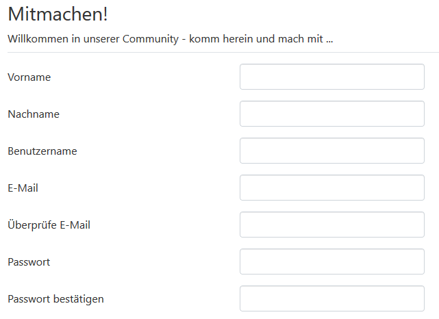 Fülle auf der nächsten Seite «Mitmachen!» alle Felder aus, die Auswahllisten kannst du auf «Standard verwenden» lassen, stimme de «Datenschutzerklärungen und Nutzungsbedinungen» zu und klicke auf Neuanmeldung und warte auf eine Email. Um den Vorgang abzuschließen klicke in der Email auf den Bestätigungslink. Melde dich mit deinem Benutzername und Passwort an.